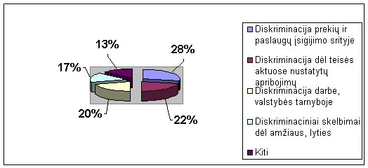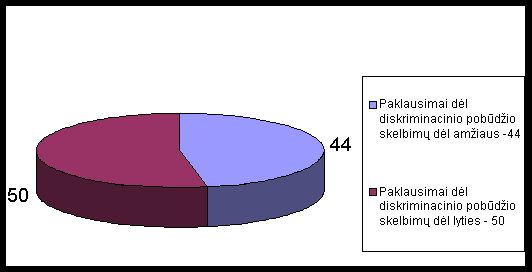 Diskriminacinių požymių turinčių skelbimų dėl amžiaus ir lyties buvo pastebėta apylygiai dėl amžiaus - 44, dėl lyties - 55. 2003 m. ataskaitiniu laikotarpiu išsiųsti 89 paklausimai dėl diskriminacinio pobūdžio skelbimų.