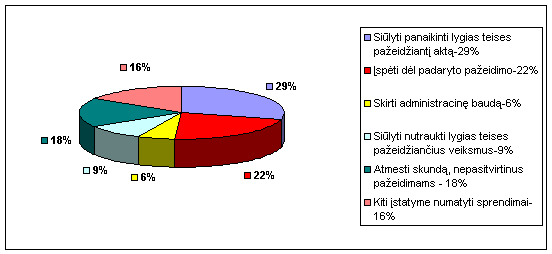 Kaip ir ankstesniais metais, 2003 metais didžioji dauguma kontrolieriaus priimtų sprendimų yra siūlymai valstybės institucijoms panaikinti ar pakeisti teises aktus taip, kad juose nebūtų moterų ir vyrų lygias teises pažeidžiančių nuostatų (11 pav.). 2003 metais buvo nagrinėtos 4 administracinės bylos ir pažeidėjams skirtos administracinės baudos. Visos administracinės baudos buvo skirtos už Moterų ir vyrų lygių galimybių įstatymo pažeidimus prekių ir paslaugų teikimo srityje. Per visus Lygių galimybių kontrolieriaus tarnybos veiklos metus stengtasi netaikyti griežtų sankcijų pažeidėjams, kaip, pavyzdžiui, administracinės baudos, kurios dydis gali būti nuo 100 iki 2000 litų. Tarnybos nuomone, administracinės baudos skyrimas pažeidėjui nėra pati tinkamiausia auklėjamoji priemonė, kurią pritaikius būtų galima tikėtis, kad moterų ir vyrų lygių galimybių principo bus laikomasi atitinkamoje įmonėje ar organizacijoje. Be abejonės, sunkiausia yra pakeisti žmonių mąstymą, ugdyti teisinio sąmonėjimo lygį bei teisinę kultūrą. Šis procesas trunka metų metus. Todėl tarnybos veiklos pradžioje buvo stengtasi supažindinti visuomenę su lyčių lygybės idėjomis, Moterų ir vyrų lygių galimybių įstatymo nuostatomis, keisti vyraujančius stereotipus apie tradicinius moteriškus ir vyriškus darbus, vaidmenis šeimos gyvenime, visuomenėje. Daug kam Moterų ir vyrų lygių galimybių įstatymo nuostatos buvo nepriimtinos, nerimtos, sukeliančios juoką, ir todėl sprendimai turėjo būti demokratiški, nesukeliantys priešiškumo vienai ar kitai lyčiai ir lyčių dialogui apskritai. 11 pav. Lygių galimybių kontrolieriaus sprendimai Pažymėtina, kad nei vienas lygių galimybių kontrolieriaus sprendimas nebuvo apskųstas, priimti sprendimai yra vykdomi. Dalis sprendimų siūlymų panaikinti ar pakeisti lygias teises pažeidžiantį aktą, yra įvykdyti, kiti siūlymai yra nagrinėjami. Tačiau visais atvejais institucijos, išnagrinėjusios kontrolieriaus siūlymą pakeisti arba panaikinti lygias teises pažeidžiantį aktą, informuoja tarnybą apie svarstymo rezultatus ir motyvuotai paaiškina, kodėl sprendimas yra nevykdomas bei kada jis bus įvykdytas. Dažnai dėl teisės aktų kodifikavimo, jų sisteminimo bei kitų priežasčių seni teisės aktai nekeičiami, bet priimami nauji teisės aktai arba jie inkorporuojami į kitus teisės aktus. Atkreiptinas dėmesys, kad visais atvejais apskųstieji asmenys ar institucijos pritaria tyrimo pažymoje išdėstytam moterų ir vyrų lygių galimybių užtikrinimo principui. Į Lygių galimybių kontrolieriaus tarnybą gyventojai turi teisę kreiptis ne tik su rašytiniais skundais, prašymais, pareiškimais, bet ir žodžiu, paskambinti telefonu ar parašyti paklausimą elektroniniu paštu. Atokesnių Lietuvos kampelių gyventojams, taip pat ir ne Vilniaus gyventojams dažnai būna sudėtinga atvykti į Lygių galimybių kontrolieriaus tarnybą ir gauti reikiamą konsultaciją. Dažnai žmonės būna nenusiteikę rašyti skundo, bet nori pasitarti dėl galimų problemos sprendimo būdų, sužinoti savo teises, kurias nustato įstatymai, išsiaiškinti, kaip galima apsisaugoti nuo galimų diskriminacinių veiksmų. Per metus į tarnybą žodžiu kreipiasi per 200 interesantų, kurie teiraujasi apskritai dėl visų Lietuvos teisės aktų nuostatų, jų manymu, pažeidžiančių moterų ir vyrų lygias galimybes. Labai dažnai į tarnybą kreipiasi moterys, esančios nėštumo atostogose ar auginančios vaiką iki 1 metų amžiaus, ir teiraujasi dėl joms įstatymų suteikiamų garantijų grįžti į darbą, pasibaigus šioms atostogoms. Visiems interesantams suteikiama teisinė konsultacija, jeigu tokios konsultacijos neįmanoma suteikti iš karto, interesantui paskambinama vėliau.
