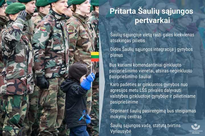 Seimas priėmė naują Lietuvos šaulių sąjungos įstatymo redakciją, kuria nuspręsta pertvarkyti Lietuvos šaulių sąjungą (LŠS). Tokiu būdu siekiama stiprinti Lietuvos šaulių sąjungą kaip Lietuvos kariuomenės, ginkluotųjų pajėgų ir pilietinio pasipriešinimo agresijai jungiamąją grandį, pilietinio, patriotinio ir tautinio ugdymo subjektą bei kitų valstybės institucijų talkininkę.