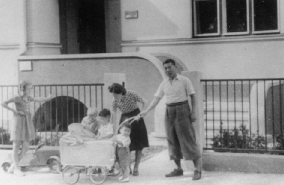 Sugiharų šeima priešais konsulato pastatą Kaune, 1940 m. Šeimos archyvo nuotrauka