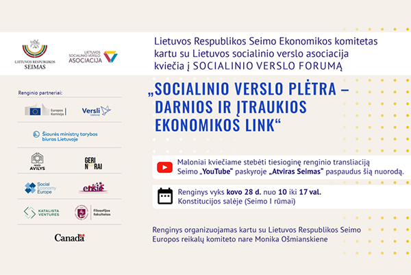Kovo 28 d., pirmadienį, Seimo Konstitucijos salėje (I rūmai) ir nuotoliniu būdu vyks Lietuvos socialinio verslo forumas „Socialinio verslo plėtra – darnios ir įtraukios ekonomikos link“. Pradžia – 10 val.