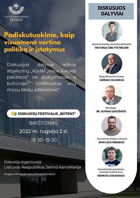Rugsėjo 2–3 dienomis Birštone vyks 4-asis diskusijų festivalis BŪTENT, kuriame pirmą kartą dalyvaus Seimas. Tūkstančius dalyvių iš visos Lietuvos sutraukiantis renginys ir šiemet į Birštoną suburs aktualioms diskusijoms neabejingus žmones.