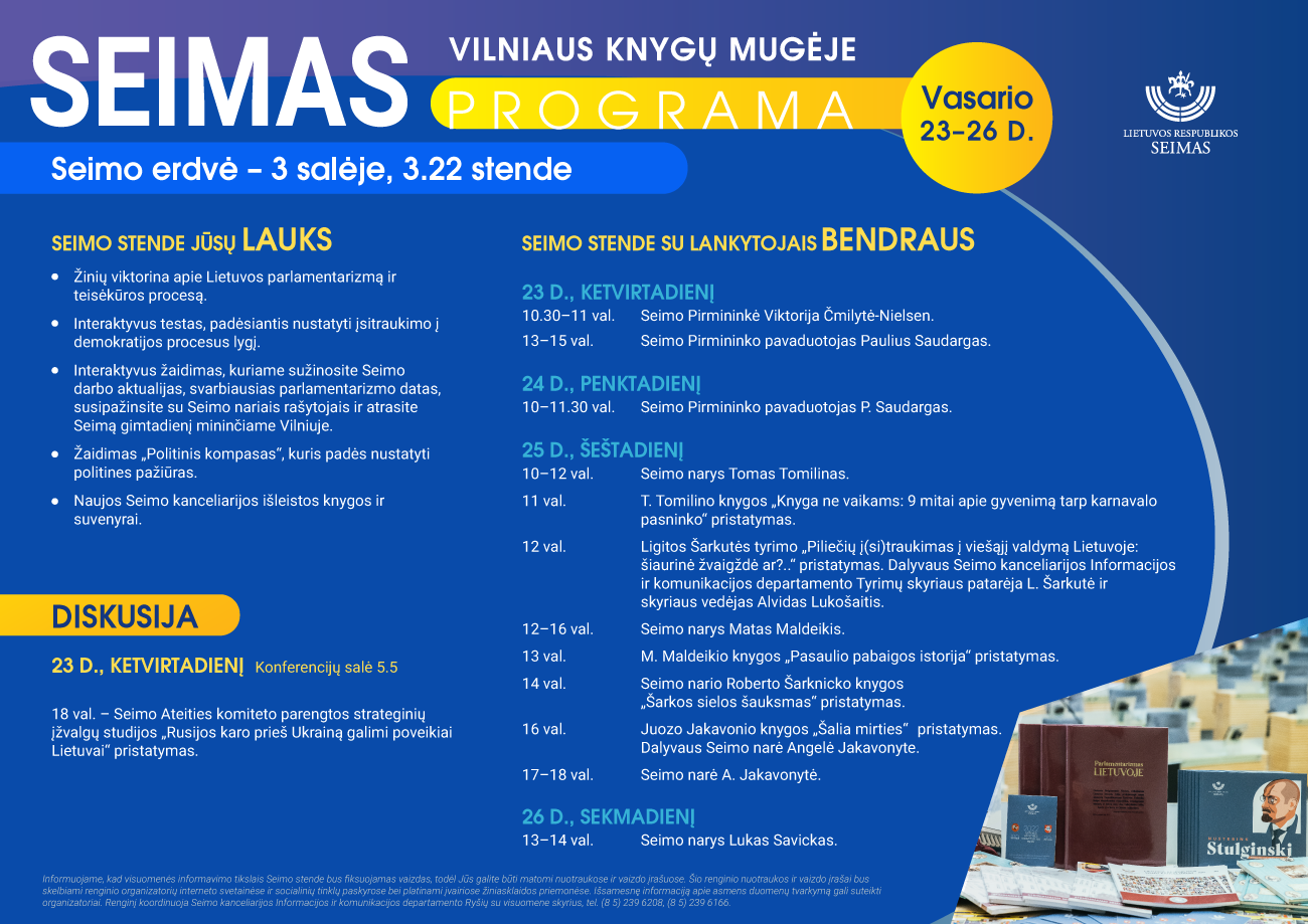 Vasario 23–26 dienomis Seimas antrą kartą įsitrauks į didžiausią šalyje kultūros šventę – 23-iąją tarptautinę Vilniaus knygų mugę. Sostinės Vilniaus 700-ajam gimtadieniui dedikuotame renginyje Seimo stendas pakvies per įvairias veiklas iš arčiau susipažinti su parlamento darbu ir atrasti skaitantį ir kuriantį parlamentą.