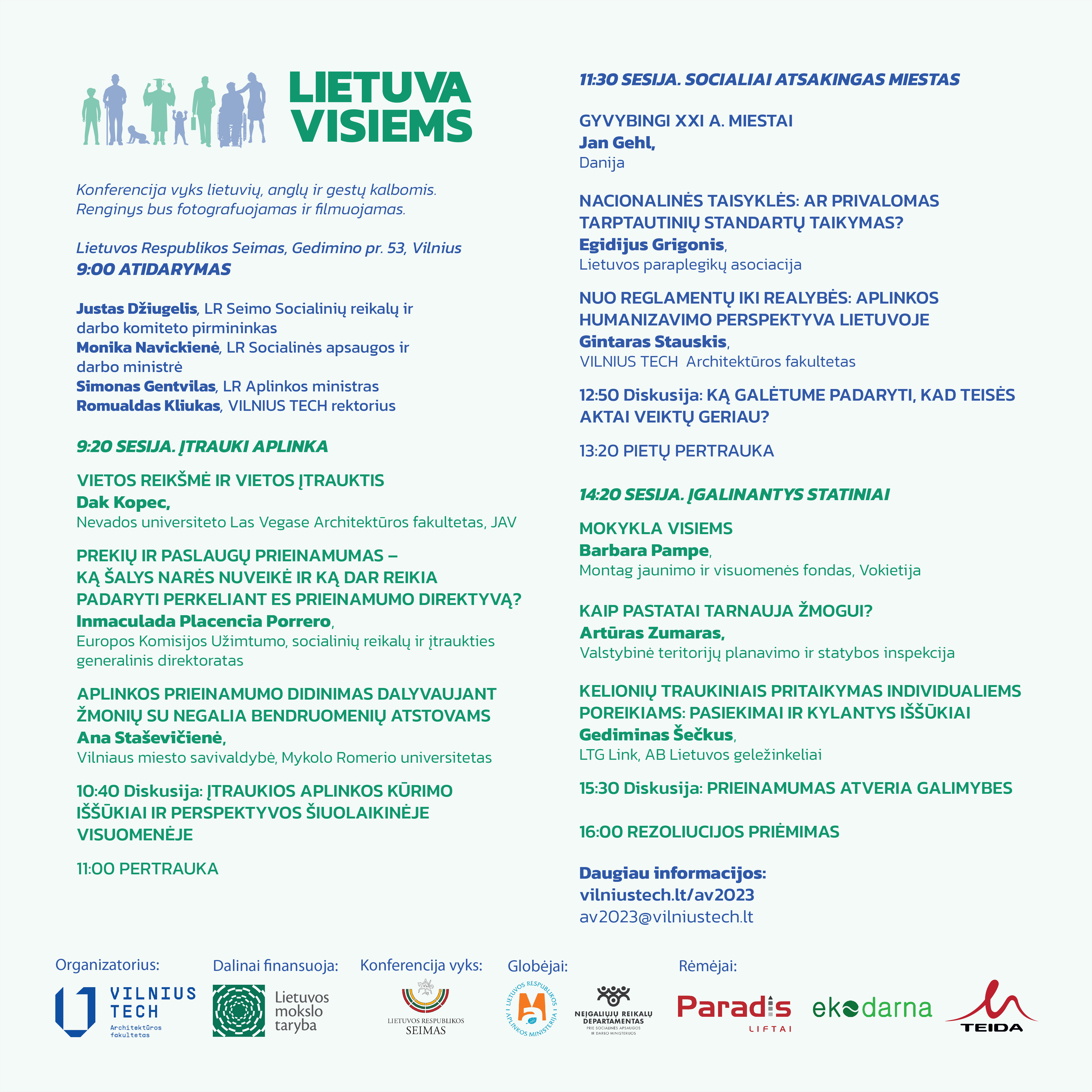 Gruodžio 4 d., pirmadienį, 9 val. Seimo Konstitucijos salėje (I rūmai) VILNIUS TECH Architektūros fakultetas kartu su Seimu ir Aplinkos ministerija organizuoja tarptautinę konferenciją „Lietuva visiems“, kurioje bus analizuojama humanizuotos aplinkos Lietuvoje formavimo patirtis ir problemos pastarųjų dešimtmečių perspektyvoje.