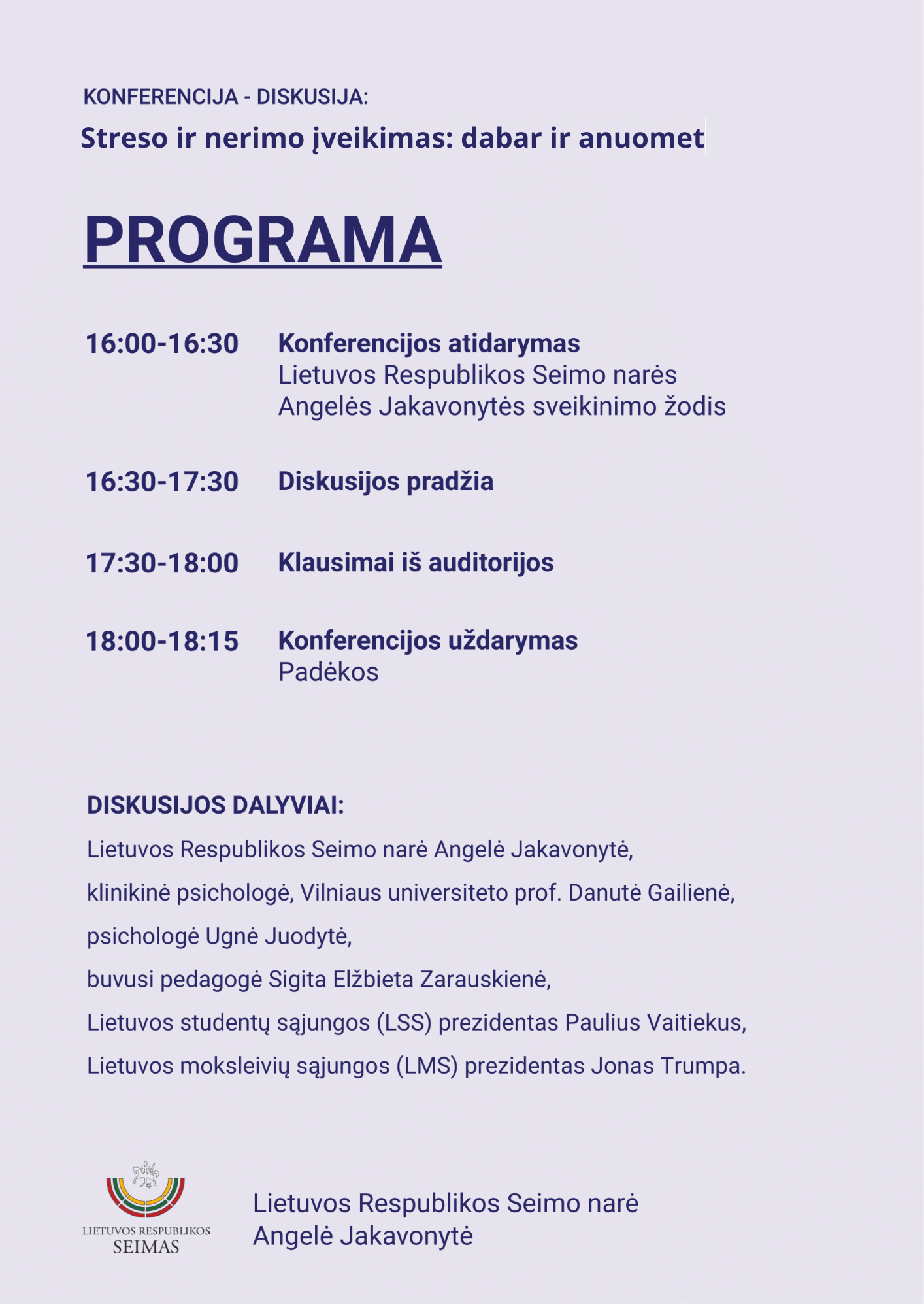 Balandžio 29 d., pirmadienį, 16 val. Seimo Kovo 11-osios Akto salėje vyks konferencija-diskusija „Streso ir nerimo įveikimas: dabar ir anuomet“. Konferencijos iniciatorė Seimo narė Angelė Jakavonytė.
