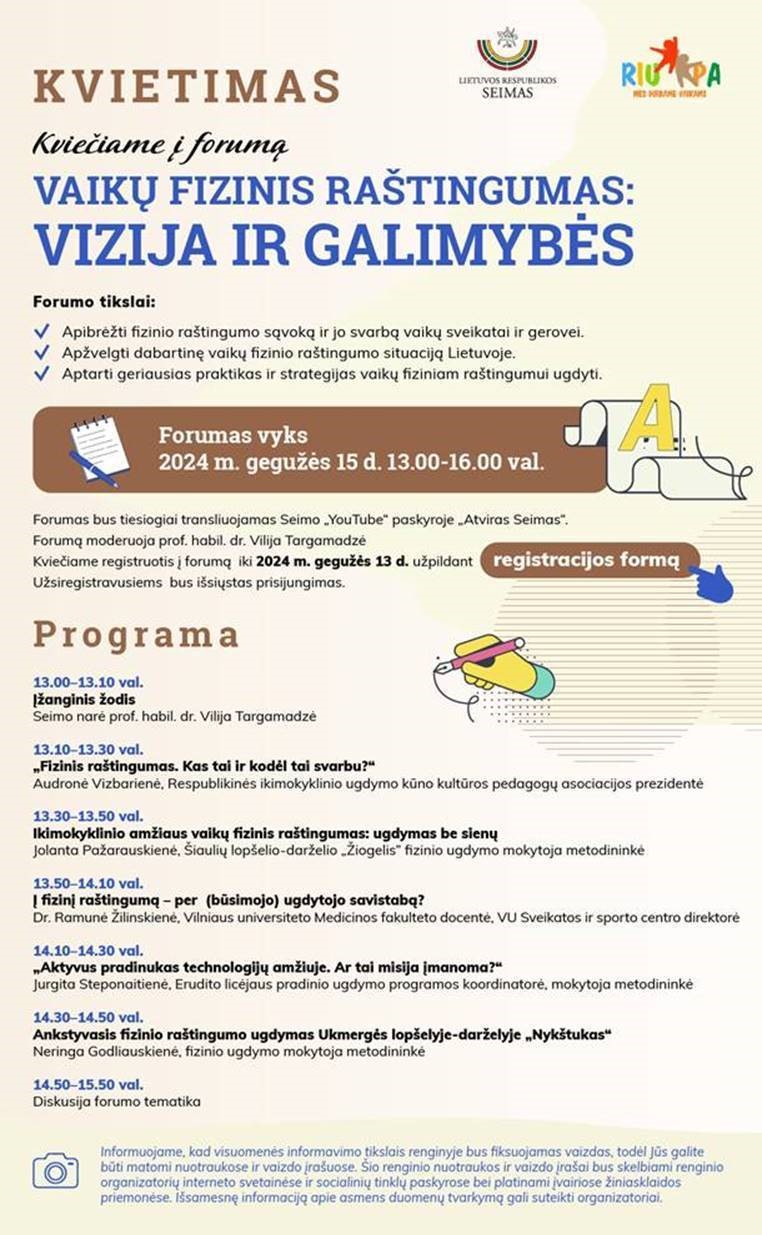 Gegužės 15 d., trečiadienį, 13 val., Seimo I rūmų 315 kab. vyks nuotolinis forumas „Vaikų fizinis raštingumas: vizija ir galimybės“.