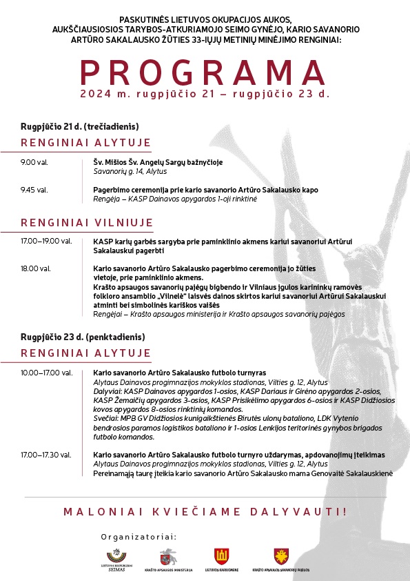 Rugpjūčio 21 ir 23 d. Alytuje ir Vilniuje vyks paskutinės Lietuvos okupacijos aukos, kario savanorio, Lietuvos Respublikos Aukščiausiosios Tarybos-Atkuriamojo Seimo gynėjo Artūro Sakalausko 33-iųjų žūties metinių minėjimo renginiai (RENGINIŲ PROGRAMA).