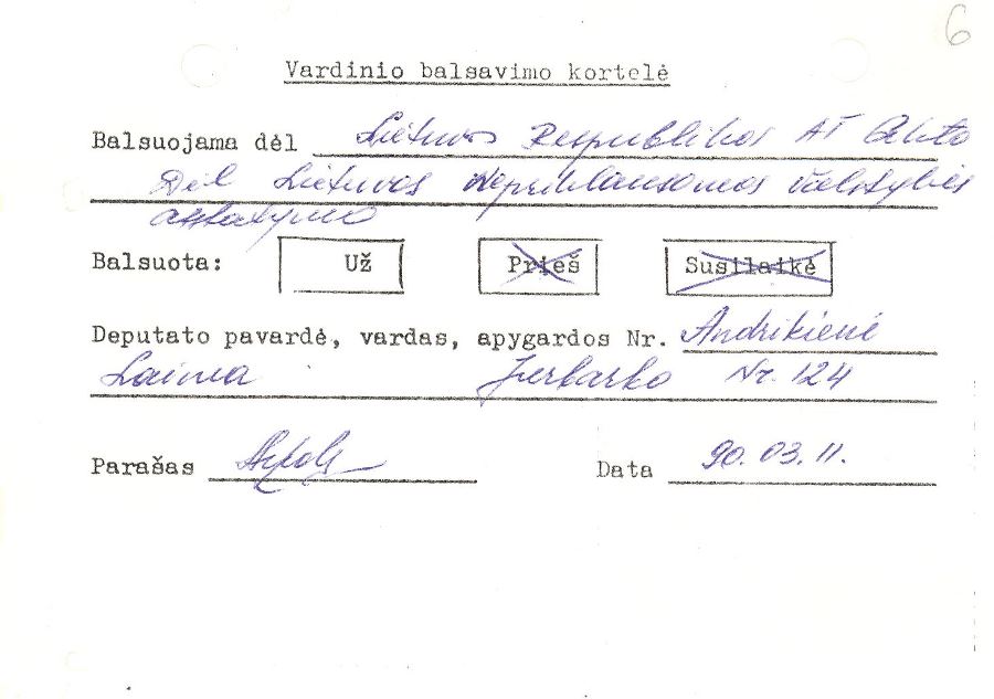 Lietuvos Respublikos Seimo archyvas. F. 2, ap. 1, b. 17, l. 6