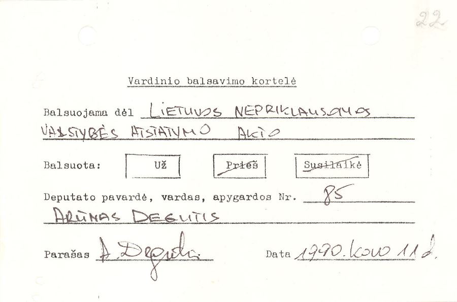 Lietuvos Respublikos Seimo archyvas. F. 2, ap. 1, b. 17, l. 22