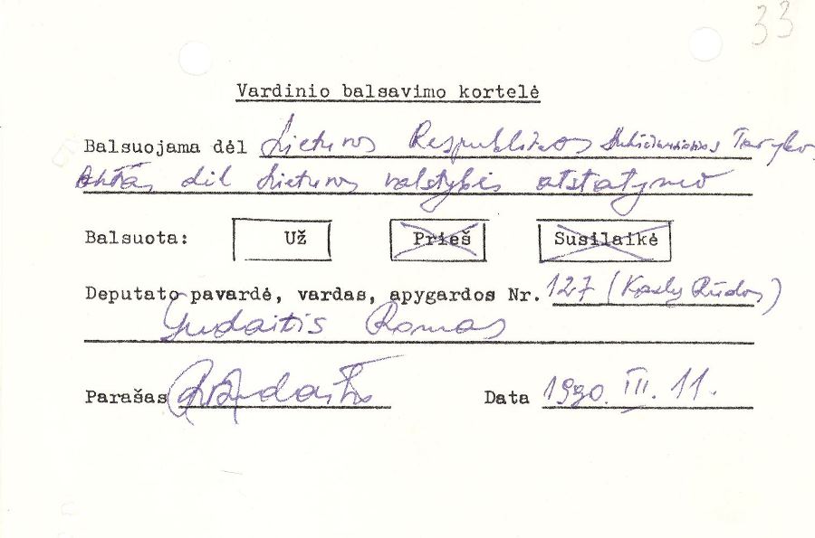 Lietuvos Respublikos Seimo archyvas. F. 2, ap. 1, b. 17, l. 33