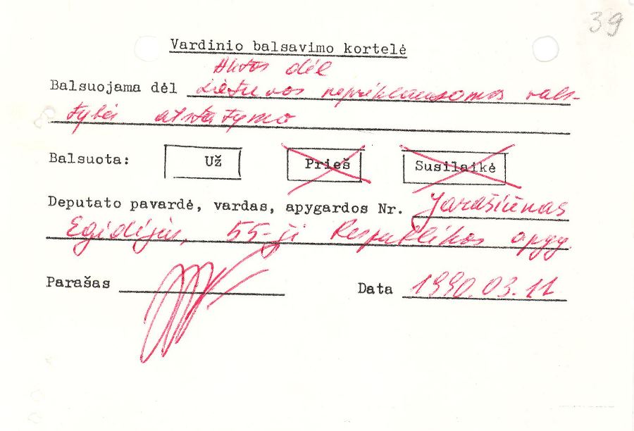 Lietuvos Respublikos Seimo archyvas. F. 2, ap. 1, b. 17, l. 39