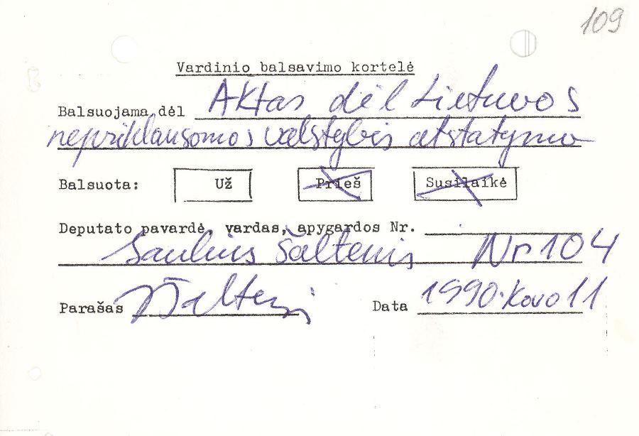 Lietuvos Respublikos Seimo archyvas. F. 2, ap. 1, b. 17, l. 109