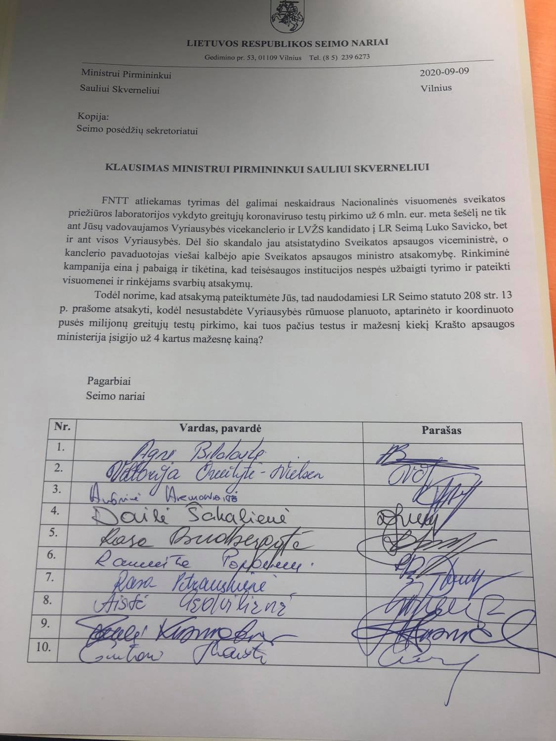 „Finansinių nusikaltimų tyrimo tarnyba atliekamas tyrimas dėl galimai neskaidraus Nacionalinės visuomenės sveikatos priežiūros laboratorijos vykdyto greitųjų koronaviruso testų pirkimo už 6 mln. eurų meta šešėlį ne tik ant Jūsų vadovaujamos Vyriausybės vicekanclerio ir Lietuvos valstiečių ir žaliųjų sąjungos kandidato į Lietuvos Respublikos Seimą Luko Savicko, bet ir ant visos Vyriausybės. Dėl šio skandalo jau atsistatydino sveikatos apsaugos viceministrė, o kanclerio pavaduotojas viešai kalbėjo apie sveikatos apsaugos ministro atsakomybę. Rinkiminė kampanija eina į pabaigą ir tikėtina, kad teisėsaugos institucijos nespės užbaigti tyrimo ir pateikti visuomenei ir rinkėjams svarbių atsakymų. Todėl norime, kad atsakymą pateiktumėte Jūs – naudodamiesi Seimo statuto 208 str. 13 p. prašome atsakyti, kodėl nesustabdėte Vyriausybės rūmuose planuoto, aptarinėto ir koordinuoto pusės milijonų greitųjų testų pirkimo, kai tuos pačius testus ir mažesnį kiekį Krašto apsaugos ministerija įsigijo už 4 kartus mažesnę kainą?“ – klausimą premjerui TS-LKD frakcijos seniūno pavaduotojos ir Seimo Antikorupcijos komisijos narės Agnės Bilotaitės inicijuotame kreipimesi užduoda opozicijos atstovės.