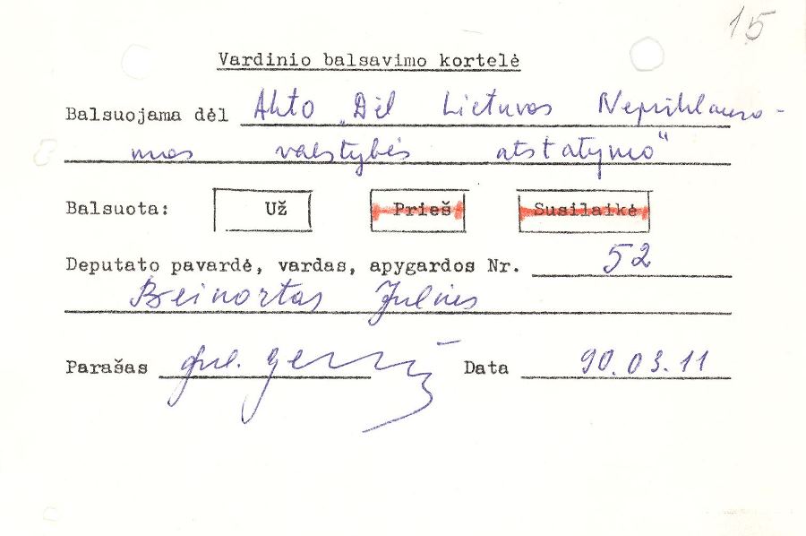 Lietuvos Respublikos Seimo archyvas. F. 2, ap. 1, b. 17, l. 15