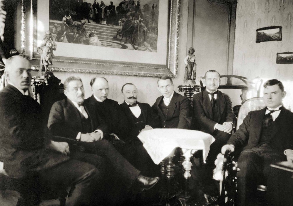 Iš kairės: Lietuvos delegacijos pirmininkas Pabaltijo konferencijoje Jurgis Šaulys, Steigiamojo Seimo narai Ozeris Finkelšteinas, Vladas Jurgutis ir Mykolas Sleževičius, Lietuvos reikalų patikėtinis Latvijoje Dovas Zaunius, Steigiamojo Seimo narys Kazimieras Jokantas ir Steigiamojo Seimo prezidiumo narys – pirmasis sekretorius Ladas Natkevičius.