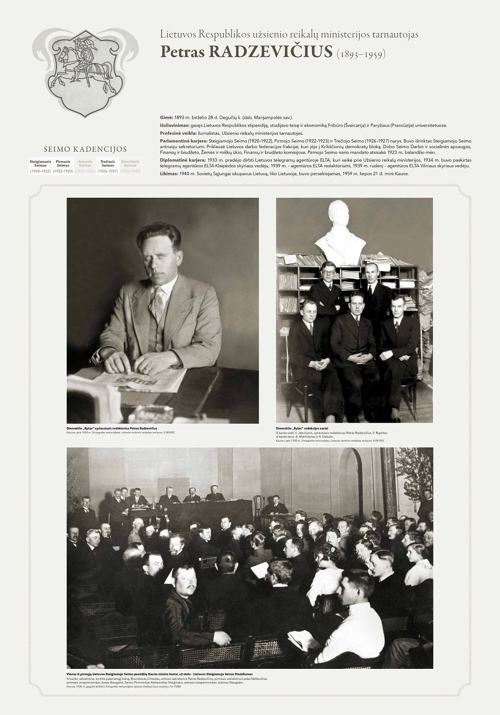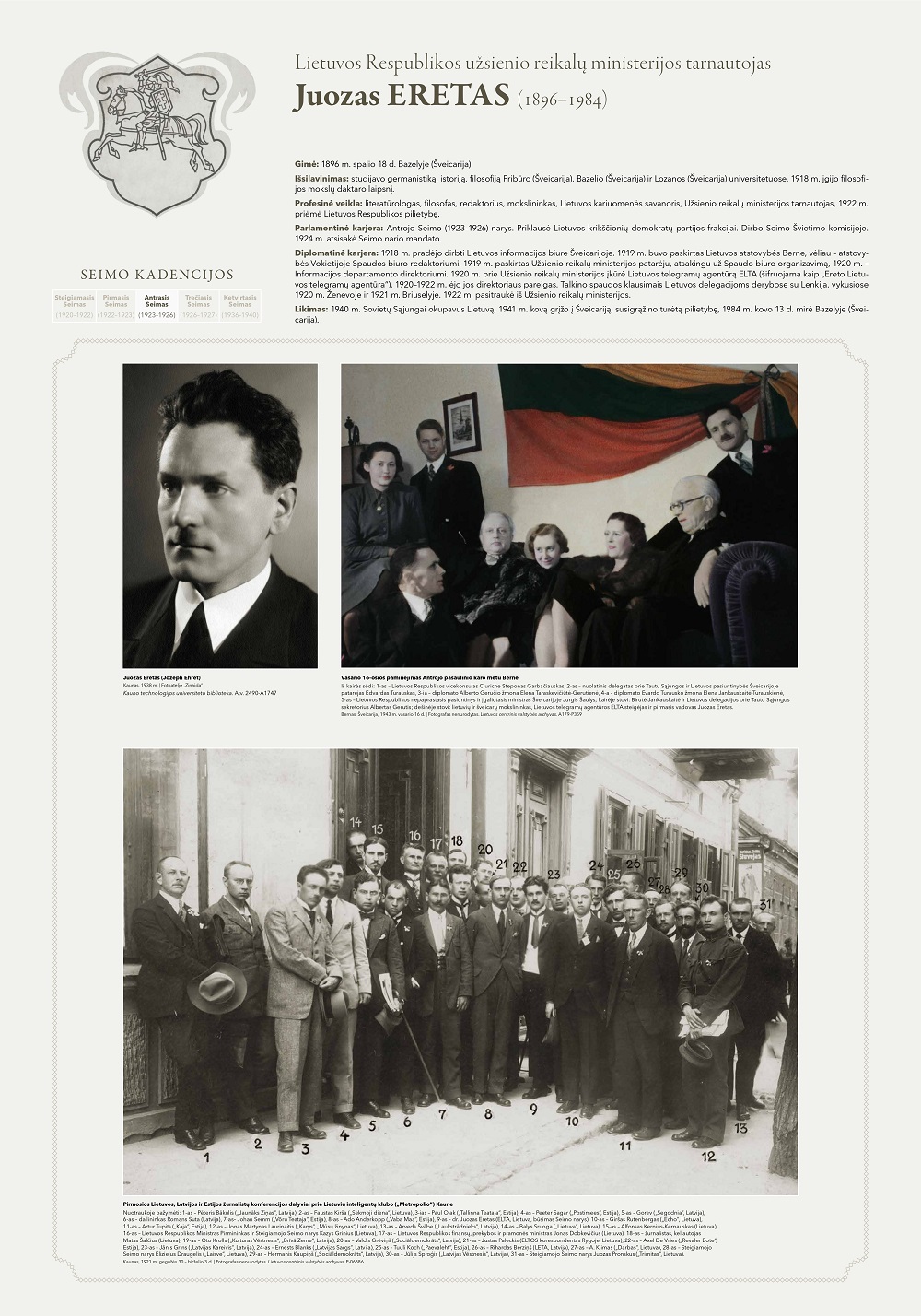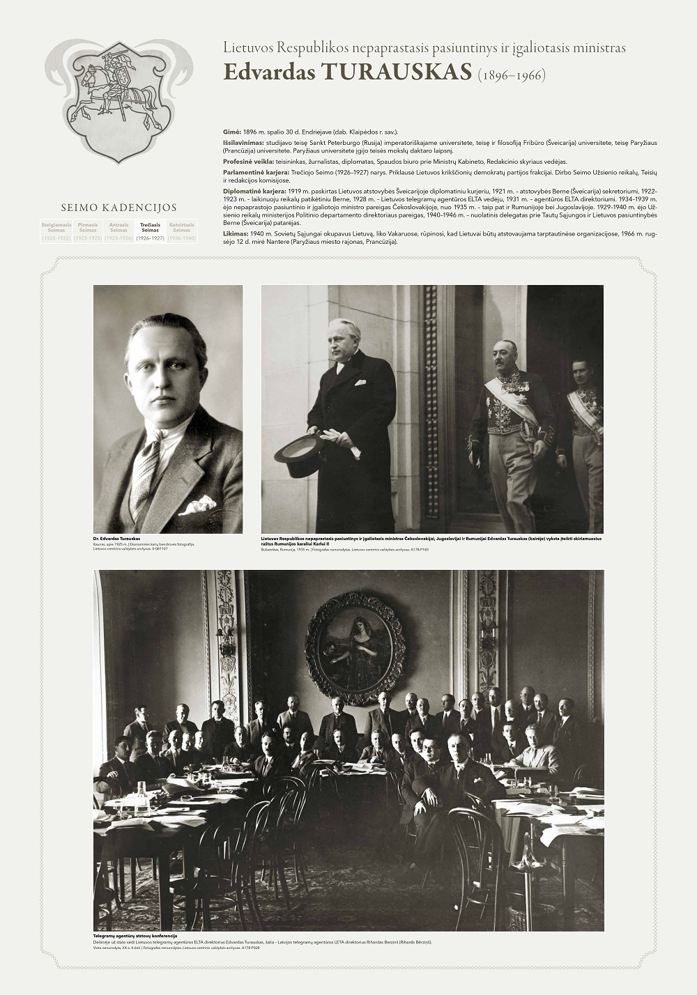 Antroji parodos dalis skirta pristatyti 1920–1927 metų Lietuvos Respublikos Seimo narius, kurie yra dirbę Lietuvos diplomatinėje tarnyboje, Užsienio reikalų ministerijoje ar prie jos veikusioje Lietuvos telegramų agentūroje ELTA. Galbūt tik nedaugelis yra atkreipęs dėmesį, kad šios agentūros steigėjas šveicarų kilmės mokslininkas ir Lietuvos bičiulis Juozapas Eretas buvo išrinktas Lietuvos Respublikos Seimo nariu. Dalis tautos atstovų į Seimą atėjo jau turėdami diplomatinio darbo patirties, kiti diplomato karjerą pasirinko baigę darbą parlamente. Apskritai, dauguma šios parodos herojų yra geriau žinomi kaip diplomatai ar Ministrų Kabineto nariai ir žymiai rečiau, arba visiškai nėra siejami su Lietuvos Respublikos Seimu. Diplomatinėje tarnyboje dirbo beveik dvi dešimtys 1920–1927 m. kadencijos Lietuvos Respublikos Seimo narių: šeši vadovavo Lietuvos diplomatijai – ėjo Lietuvos Respublikos užsienio reikalų ministro pareigas: Juozas Purickis, Vladas Jurgutis, Valdemaras Vytautas Čarneckis, Leonas Bistras, Mykolas Sleževičius, Augustinas Voldemaras (Leonas Bistras yra ėjęs ir Lietuvos Respublikos Seimo Pirmininko pareigas), dar šeši atstovavo Lietuvai kaip nepaprastieji pasiuntiniai ir įgaliotieji ministrai įvairiose užsienio valstybėse – tai aukščiausias to meto Lietuvos diplomato rangas, kiti atstovavo Lietuvai tarptautinėse organizacijose, įsiliejo į Lietuvos telegramų agentūros ELTA veiklą.