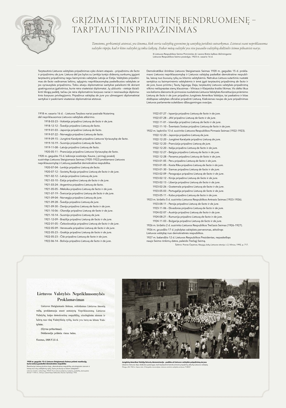 Tiek 1918 m. vasario 16-ąją valstybę atkūrusios, tiek 1990 m. kovo 11-ąją valstybės nepriklausomybę atkūrusios Lietuvos kelias į tarptautinį pripažinimą buvo nelengvas ir pažymėtas dramatiškų įvykių. Stebėtina, kiek daug paralelių sieja XX amžiaus pradžios ir amžiaus pabaigos nepriklausomybės įtvirtinimo ir tarptautinio pripažinimo procesą. Svarbų vaidmenį tarptautinio pripažinimo kelyje atliko Lietuvos Respublikos Seimas – demokratiškai išrinkta Tautos atstovybė, kurią pasaulio valstybės pripažino visateise tautos valios reiškėja.