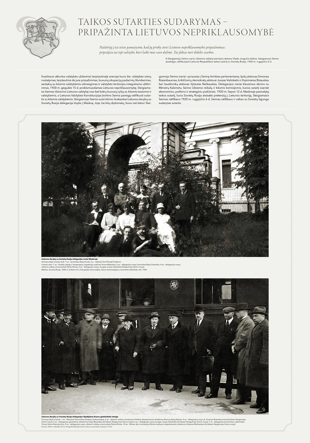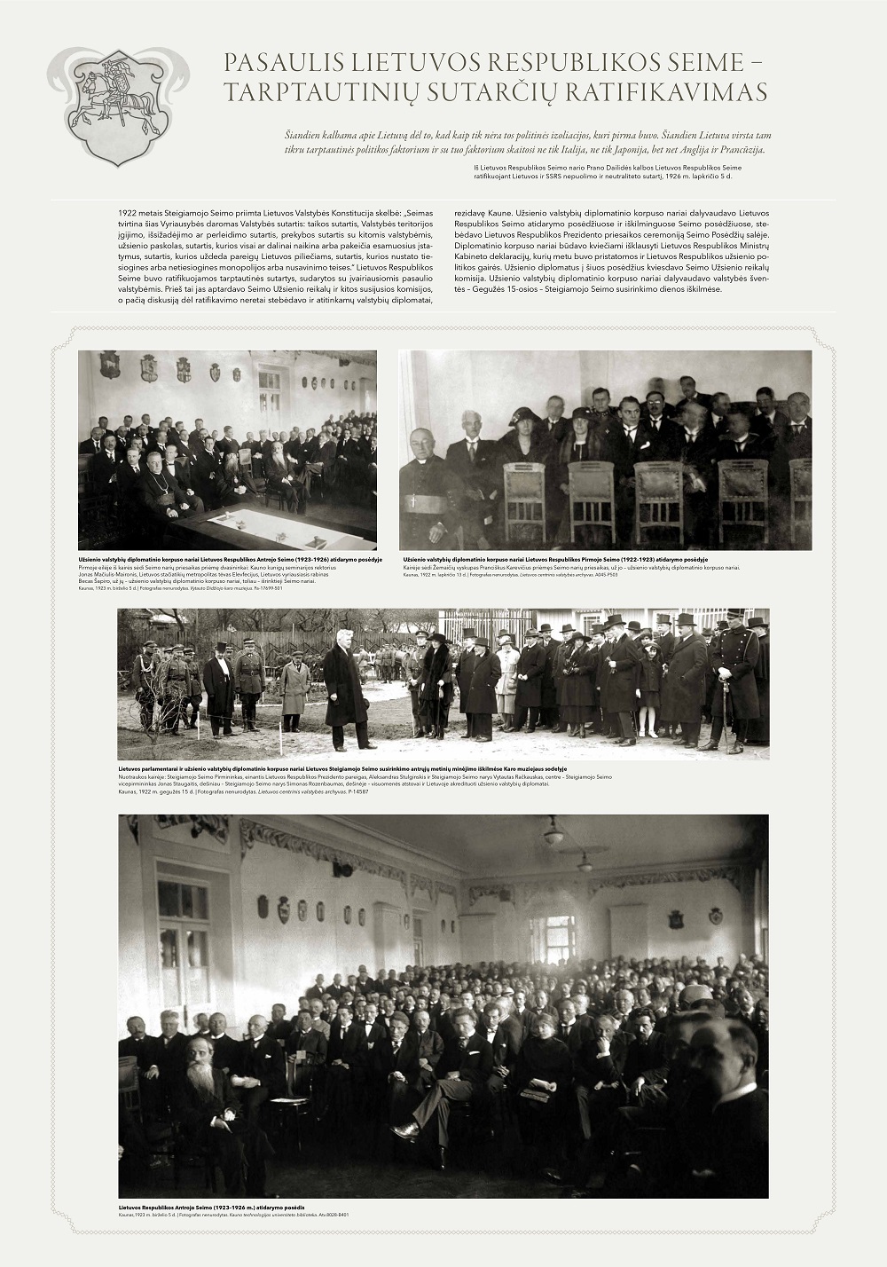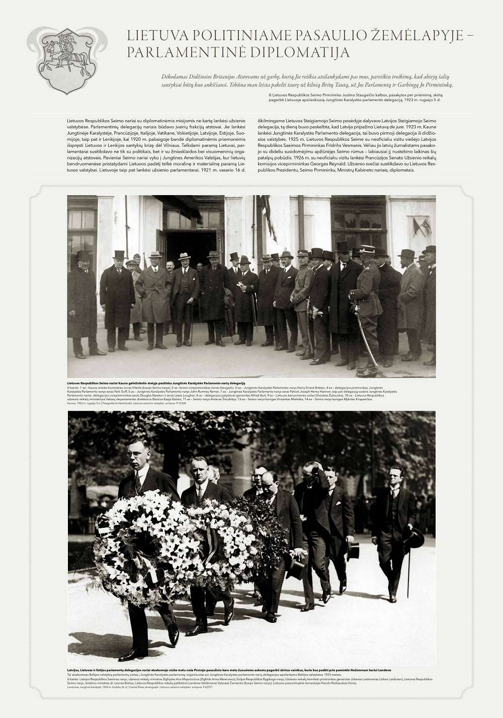 Lietuvos Respublikos Seimo kanceliarijos, Parlamentarizmo istorinės atminties skyriaus parengta paroda yra sudaryta iš dviejų dalių. Pirmojoje dalyje – bendroji parlamentinės diplomatijos apžvalga, pristatomos aktualiausios 1920–1927 metų diplomatijos temos, ne kartą svarstytos to meto Lietuvos Respublikos Seime: santykiai su kaimyninėmis valstybėmis, valstybės sienų klausimas, sudėtingos Vilniaus ir Klaipėdos krašto problemų sprendimų paieškos, 1920 m. liepos 12 d. Lietuvos Respublikos taikos sutartis su Sovietų Rusija, kuria Rusija pripažino Lietuvos nepriklausomybę ir atsisakė pretenzijų į jos teritoriją (plakatai su šios sutarties data nuspalvino šimtatūkstantinius 1989–1990 metais vykusius Sąjūdžio mitingus, kuriuose reikalauta Lietuvos nepriklausomybės). Taip pat pristatomas Lietuvos Respublikos Seimo vaidmuo Lietuvos valstybės užsienio politikos formavimo srityje, 1920–1927 metų Seimo Užsienio reikalų komisijos veiklos principai ir narių sudėtis, Lietuvos parlamentinių delegacijų vizitai į užsienio valstybes ir užsienio valstybių parlamentinių delegacijų vizitai Lietuvoje. Šioje parodoje pirmą kartą eksponuojama Lietuvos Steigiamojo Seimo parlamentinės delegacijos vizito Baltijos valstybėse nuotrauka. Vienas iš didžiausių ano meto įvykių buvo 1923 metų Jungtinės Karalystės parlamentinės delegacijos apsilankymas Lietuvoje, Latvijoje ir Estijoje bei atsakomasis, bendras šių trijų valstybių parlamentarų vizitas Londone, parodantis, koks tamprus tarpinstitucinis ryšys siejo Baltijos šalių Tautos atstovybes. Deja, parlamentinės demokratijos tradicija Lietuvoje nutrūko 1927-aisiais. Kai po dešimtmečio, 1933-aisiais, Lietuvoje antrą kartą lankėsi Jungtinės Karalystės parlamento delegacija, jos nebepasitiko Lietuvos Respublikos Seimo nariai – Lietuva jau keletą metų gyveno be parlamento.