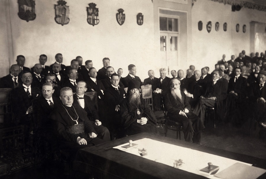 Pirmoje eilėje iš kairės sėdi Seimo narių priesaikas priėmę dvasininkai: Kauno kunigų seminarijos rektorius Jonas Mačiulis-Maironis, Lietuvos stačiatikių metropolitas tėvas Elevfecijus, Lietuvos vyriausiasis rabinas Becas Šapiro, už jų – užsienio valstybių diplomatinio korpuso nariai, toliau – išrinktieji Seimo nariai.
