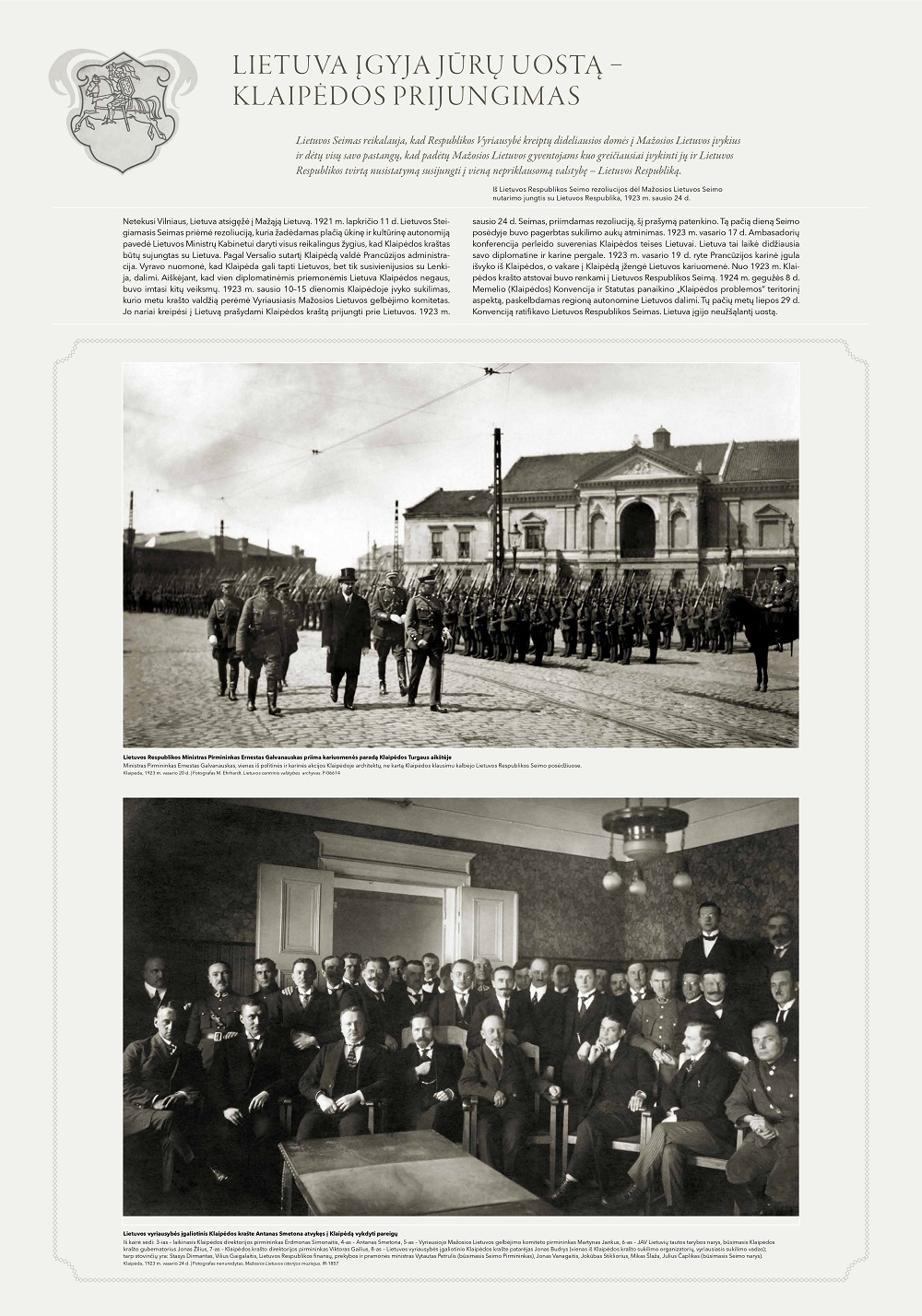 Netekusi Vilniaus, Lietuva atsigęžė į Mažąją Lietuvą. 1921 m. lapkričio 11 d. Lietuvos Steigiamasis Seimas priėmė rezoliuciją, kuria žadėdamas plačią ūkinę ir kultūrinę autonomiją pavedė Lietuvos Ministrų Kabinetui daryti visus reikalingus žygius, kad Klaipėdos kraštas būtų sujungtas su Lietuva. Pagal Versalio sutartį Klaipėdą valdė Prancūzijos administracija. Vyravo nuomonė, kad Klaipėda gali tapti Lietuvos, bet tik susivienijusios su Lenkija, dalimi. Aiškėjant, kad vien diplomatinėmis priemonėmis Lietuva Klaipėdos negaus, buvo imtasi kitų veiksmų. 1923 m. sausio 10–15 dienomis Klaipėdoje įvyko sukilimas, kurio metu krašto valdžią perėmė Vyriausiasis Mažosios Lietuvos gelbėjimo komitetas. Jo nariai kreipėsi į Lietuvą prašydami Klaipėdos kraštą prijungti prie Lietuvos. 1923 m. sausio 24 d. Seimas, priimdamas rezoliuciją, šį prašymą patenkino. Tą pačią dieną Seimo posėdyje buvo pagerbtas sukilimo aukų atminimas. 1923 m. vasario 17 d. Ambasadorių konferencija perleido suverenias Klaipėdos teises Lietuvai. Lietuva tai laikė didžiausia savo diplomatine ir karine pergale. 1923 m. vasario 19 d. ryte Prancūzijos karinė įgula išvyko iš Klaipėdos, o vakare į Klaipėdą įžengė Lietuvos kariuomenė. Nuo 1923 m. Klaipėdos krašto atstovai buvo renkami į Lietuvos Respublikos Seimą. 1924 m. gegužės 8 d. Memelio (Klaipėdos) Konvencija ir Statutas panaikino „Klaipėdos problemos“ teritorinį aspektą, paskelbdamas regioną autonomine Lietuvos dalimi. Tų pačių metų liepos 29 d. Konvenciją ratifikavo Lietuvos Respublikos Seimas. Lietuva įgijo neužšąlantį uostą.