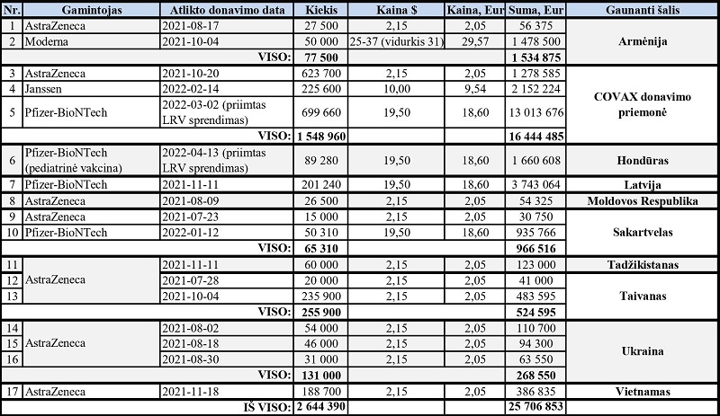 Pagal SAM pateiktą informaciją, nuo 2021 m. liepos mėn. Lietuva padovanojo kitoms šalims 2 644 390 šalyje nepanaudotų vakcinų. Dar virš 158 tūkst. vakcinų buvo utilizuotos dėl pasibaigusio galiojimo termino. Nors vakcinų kaina vis dar įslaptinta dėl pasirašytų konfidencialumo sutarčių su vakcinų gamintojais, viešoje erdvėje nesunkiai galima rasti informaciją apie vakcinų kainas. Štai, pvz., https://www.biospace.com/article/comparing-covid-19-vaccines-pfizer-biontech-moderna-astrazeneca-oxford-j-and-j-russia-s-sputnik-v/ puslapio duomenimis, vienos „AstraZeneca“ vakcinos kaina gali sudaryti apie 2,05 Eur, „Janssen“ – 9,54 Eur, „Moderna“ – 29,57 Eur, „Pfizer-BioNTech“ – 18,6 Eur. Pagal šiuos įkainius visų Lietuvos kitoms šalims padovanotų vakcinų vertė turėtų sudaryti apie 25 milijonus 700 tūkst. Eur.